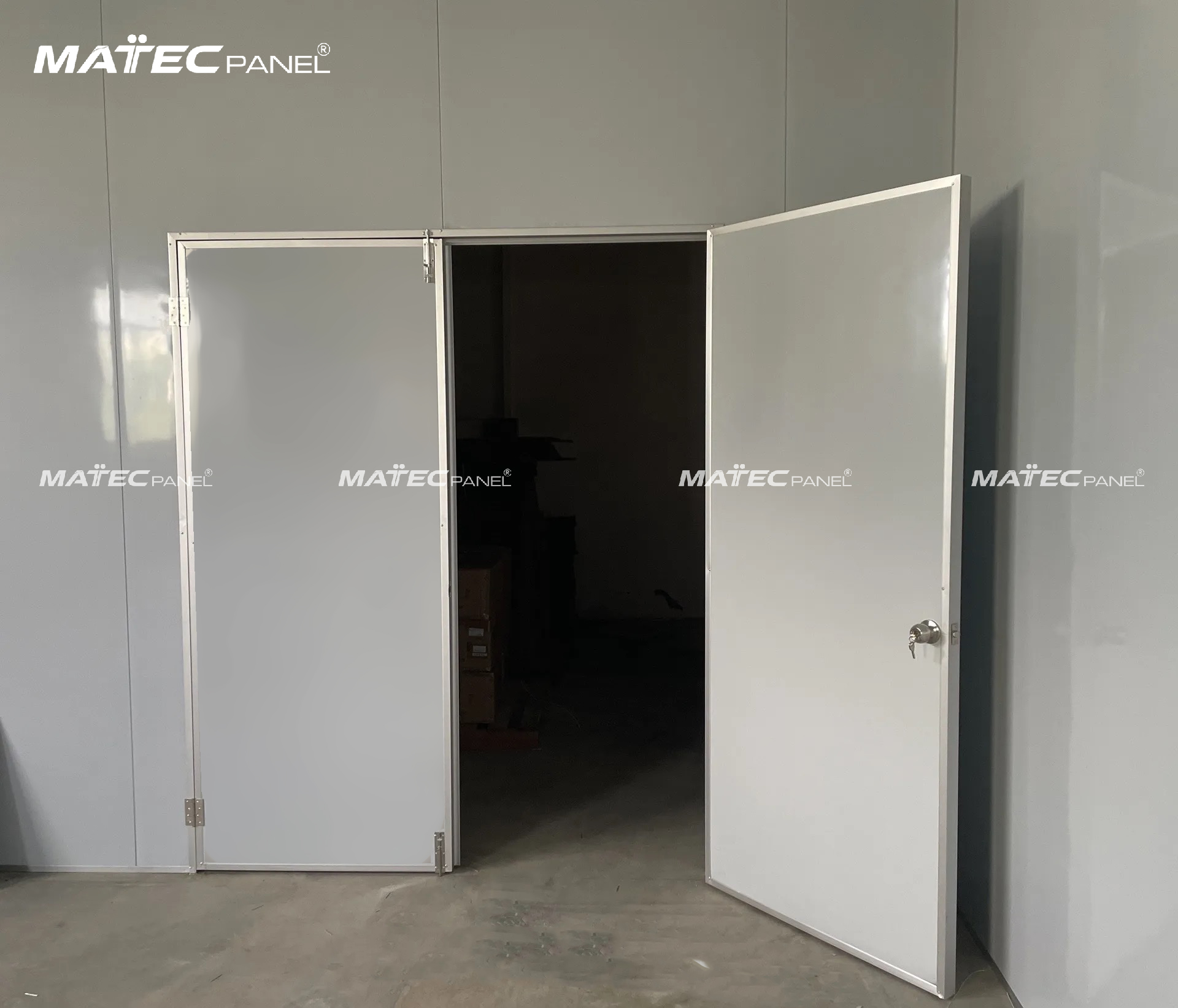 Cửa panel có thể tùy chọn khung nhôm hoặc thép tùy nhu cầu. Đi kèm là các phụ kiện như bản lề chịu lực, tay nắm inox, chốt an toàn và hệ gioăng kín giúp hạn chế gió, bụi và hơi lạnh lọt qua.