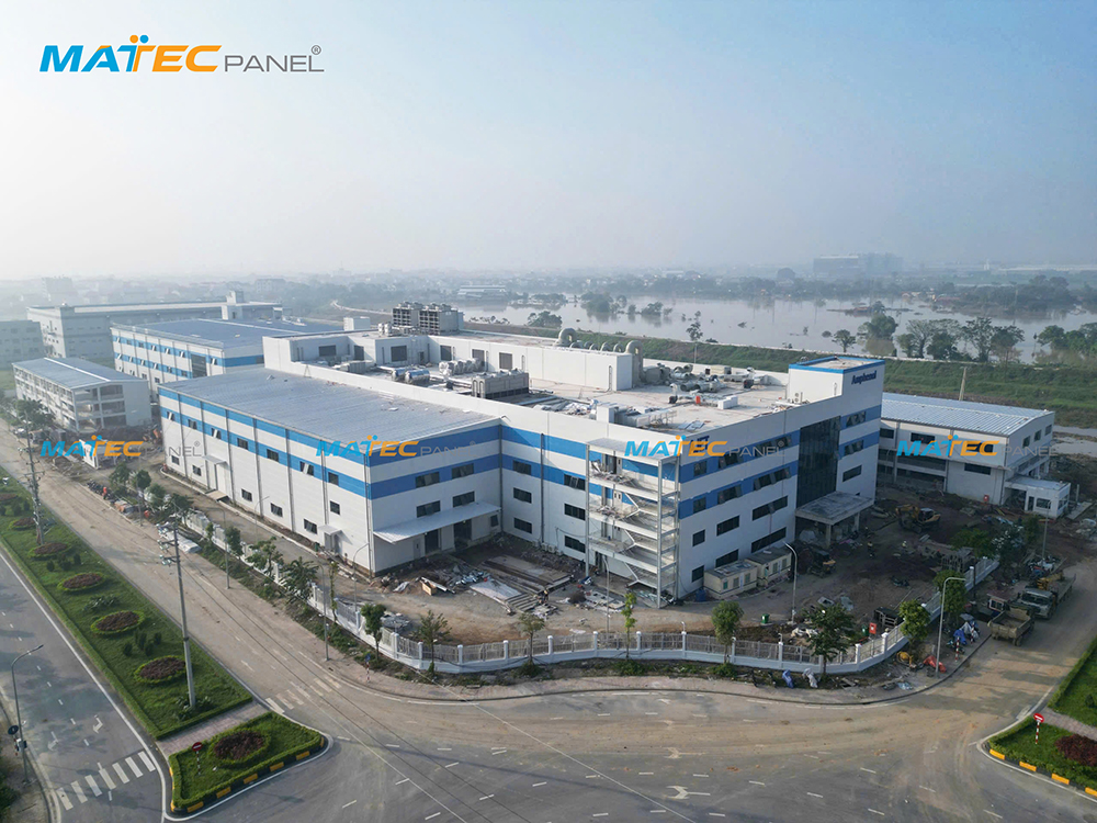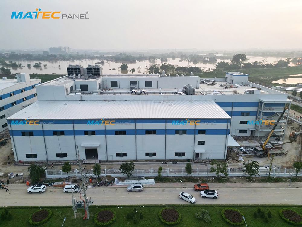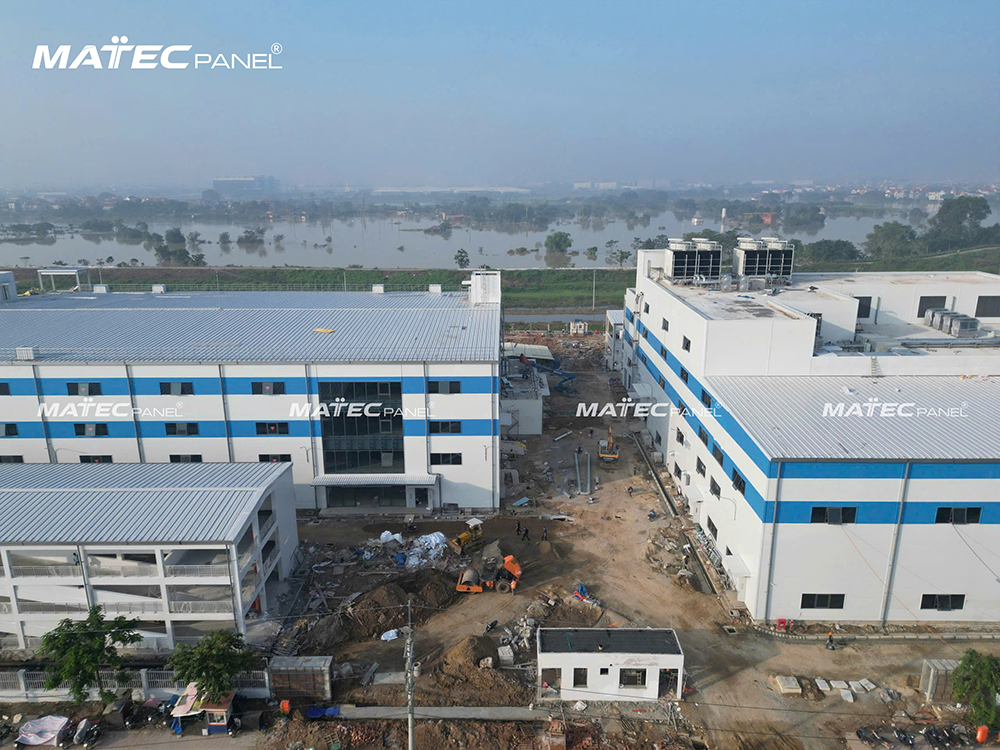 Hiện tại công trình đang trong giai đoạn lắp đặt vách ngoài bằng tấm panel ngàm che vít. Song song đó, các hạng mục vách ngăn và trần panel cũng đang được chuẩn bị triển khai.