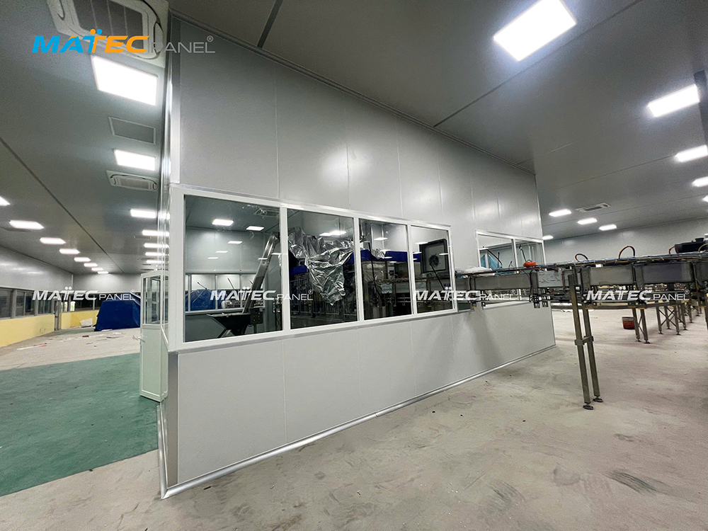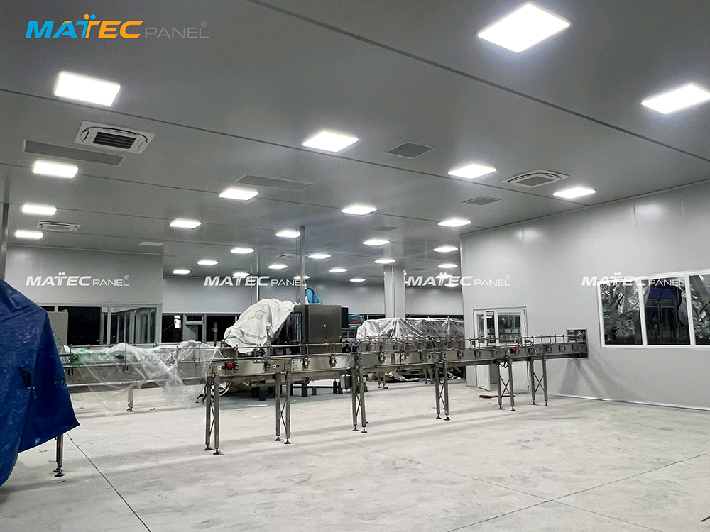 Từng tấm Panel cách nhiệt, cách âm được lắp ghép tỉ mỉ, đảm bảo tiêu chuẩn kỹ thuật nghiêm ngặt của nhà máy sản xuất thực phẩm.