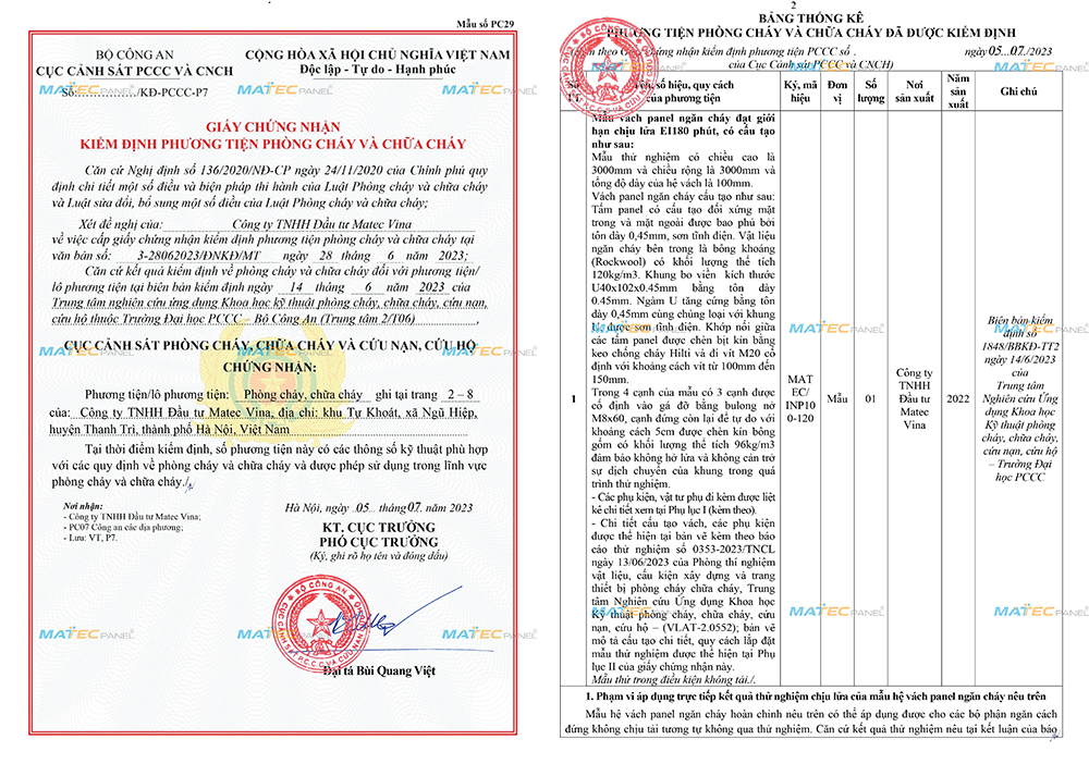 Nhà máy MatecPanel là đơn vị sản xuất đầu tiên chính thức được nhận giấy chứng nhận của cục PCCC, với sản phẩm VÁCH PANEL CHỐNG CHÁY đã đạt chứng nhận Kiểm Định Vách Panel Chống Cháy EI180
