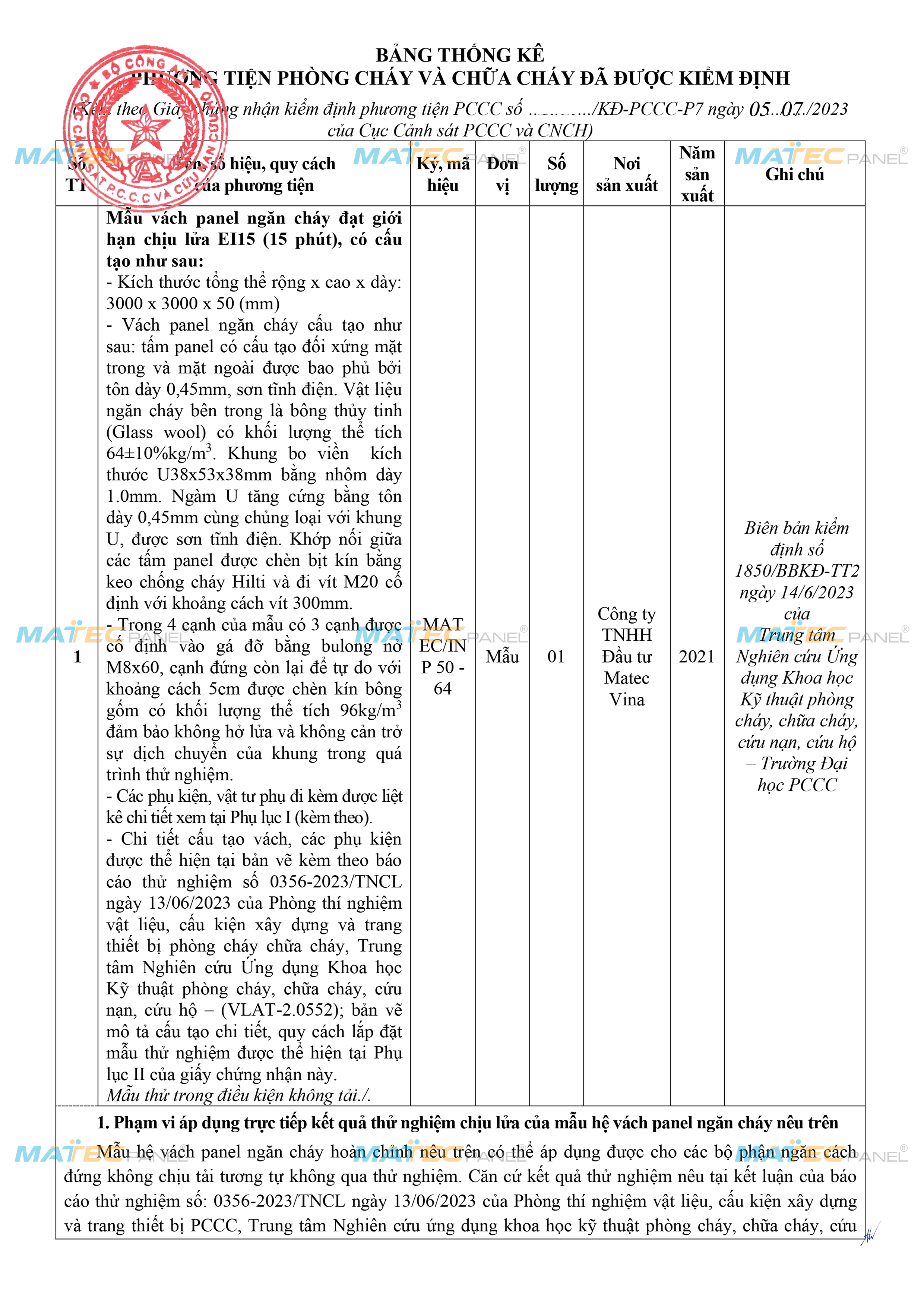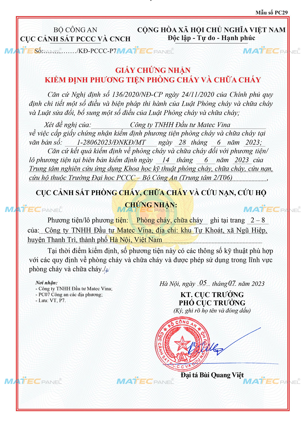 Matecpanel nhận bao chứng nhận kiểm định cho Vách Panel chống cháy EI15-EI180 theo QCVN 06:2021/BXD của Cục Phòng Cháy Chữa Cháy: