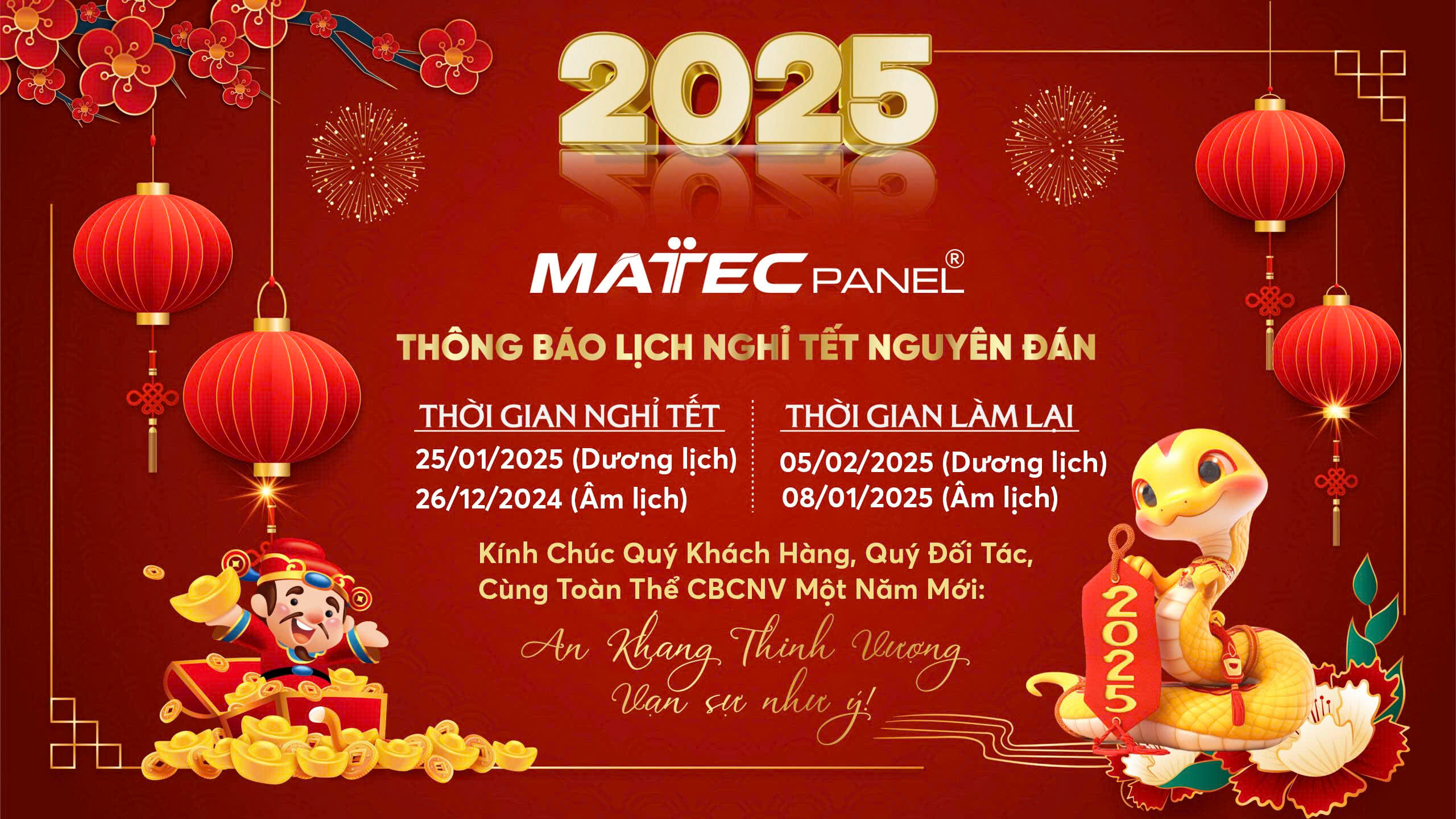 MatecPanel xin trân trọng thông báo đến Quý khách hàng, Quý đối tác về lịch nghỉ Tết Nguyên Đán Ất Tỵ 2025 như sau: